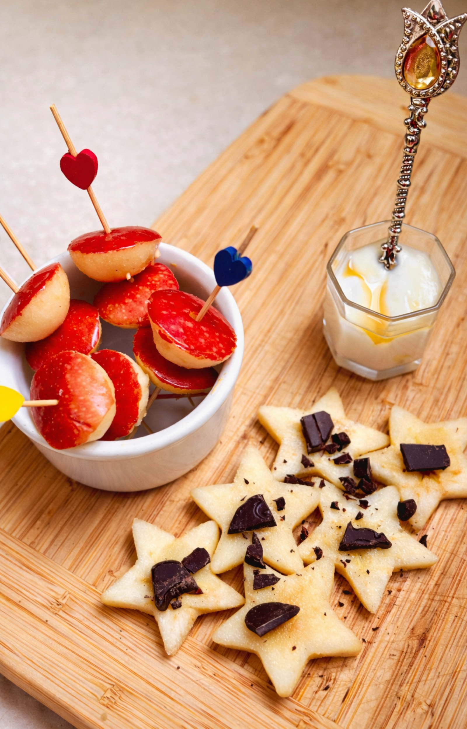 - Servir las estrellas de manzana Pink Lady® con un poco de skyr o yogur batido y un chorrito de miel por encima.