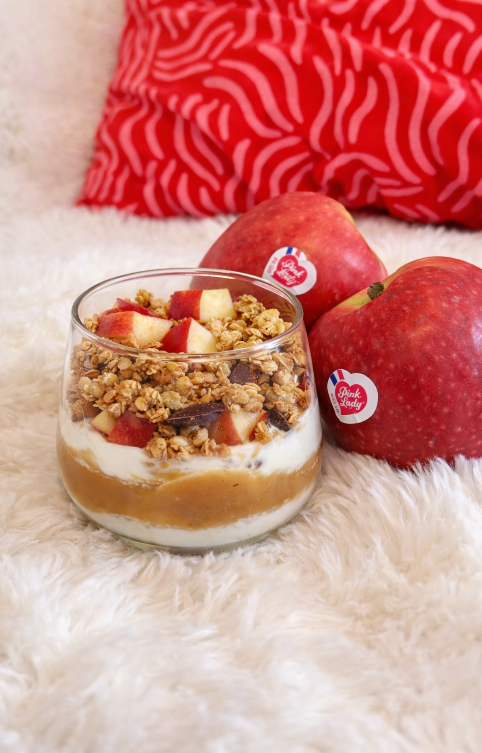 - En un recipiente, alternar una capa de yogur, un poco de compota (puede ser casera o comprada en tienda), trozos de manzana y una última capa de yogur.