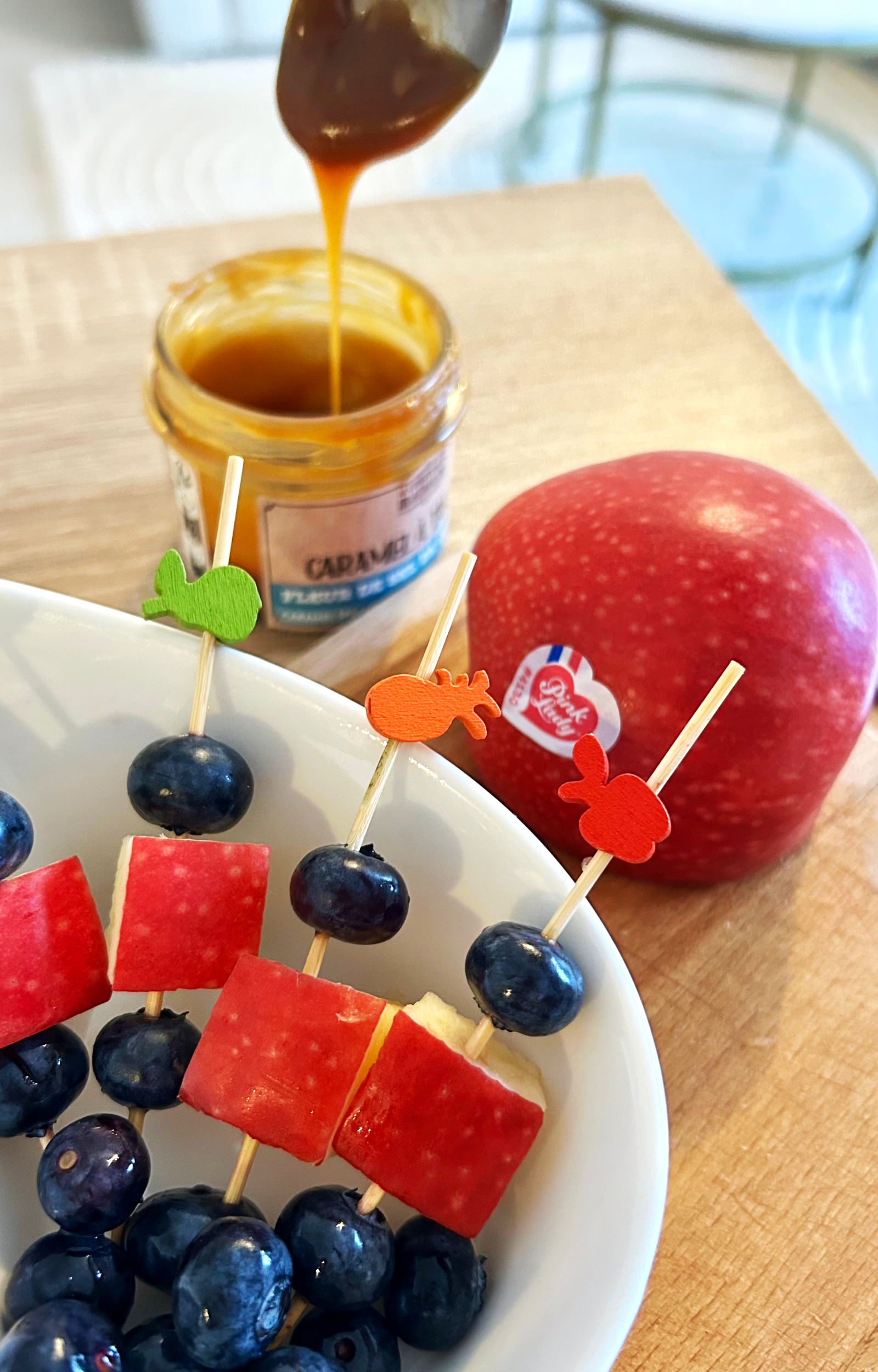 - Servir las brochetas de manzana y arándanos con un chorrito de caramelo. ¡Una combinación perfecta que no puedes dejar de probar!