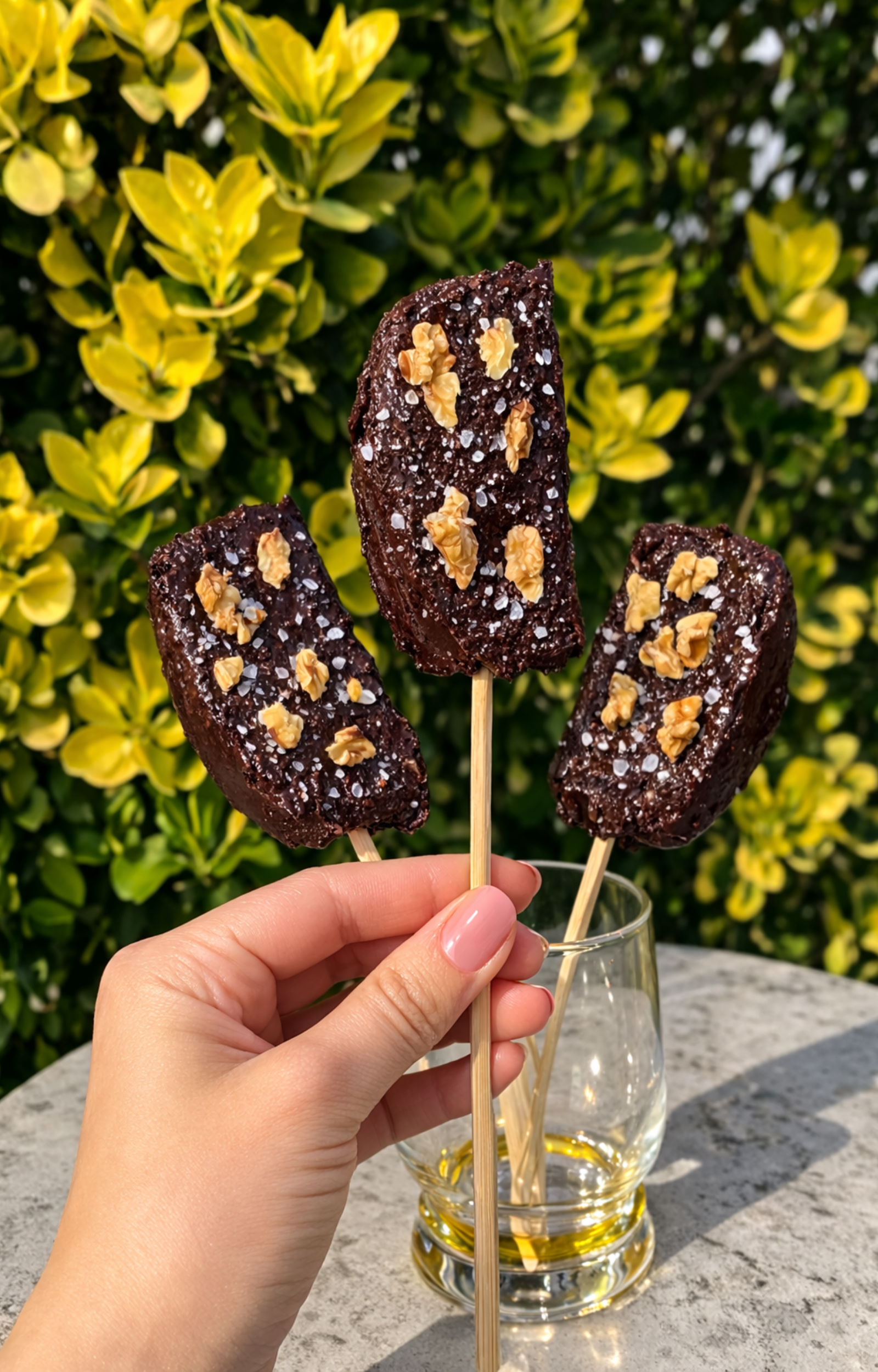 - Para terminar, decorar las brochetas de manzana con chocolate con trocitos de nueces y una pizca de flor de sal antes de que el chocolate se endurezca.