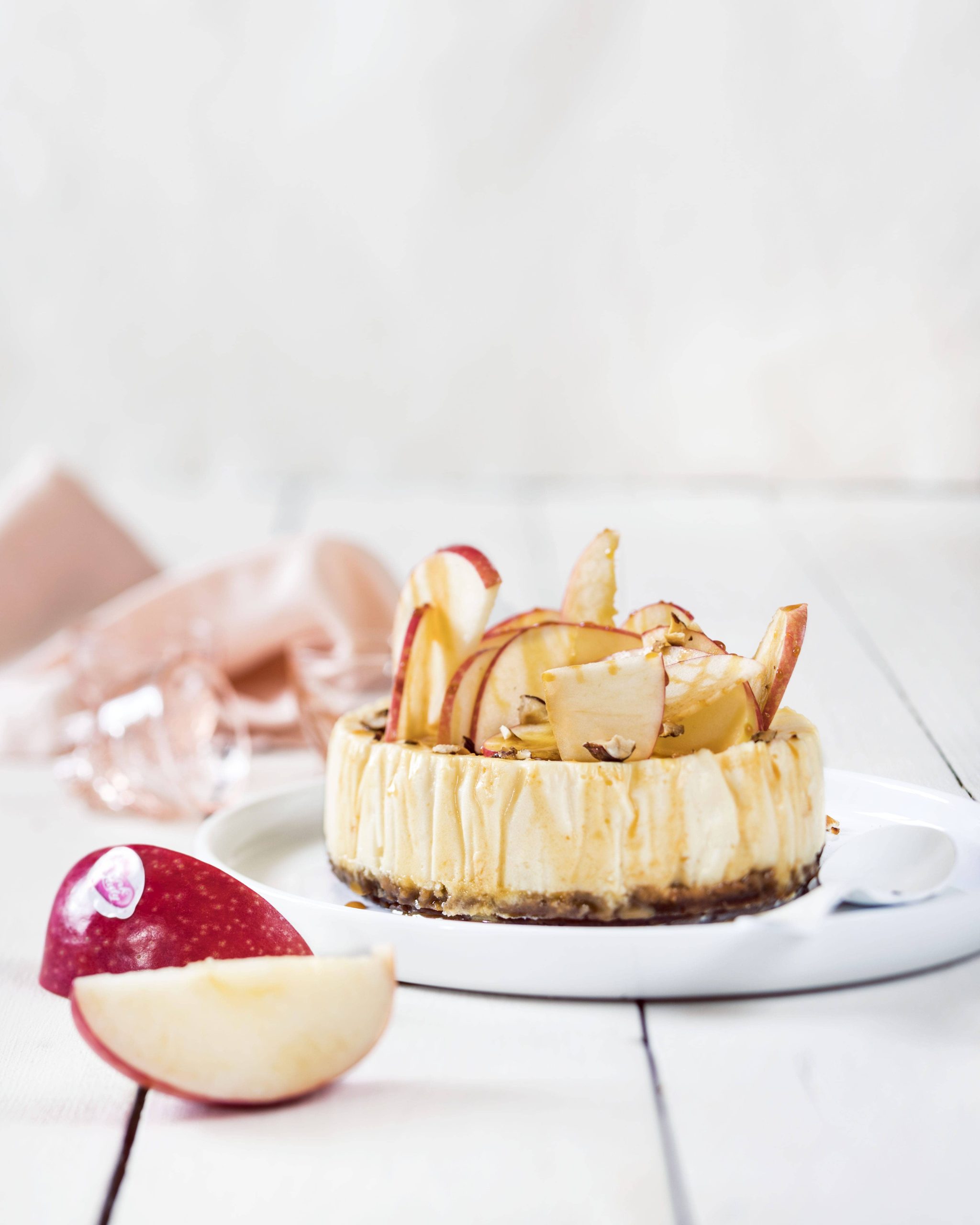 - Cortar unas buenas rodajas finas de Pink Lady® y colocarlas de forma estética encima de los pasteles. Verter un generoso chorro de mantequilla salada y terminar espolvoreando avellanas a trozos tostadas.