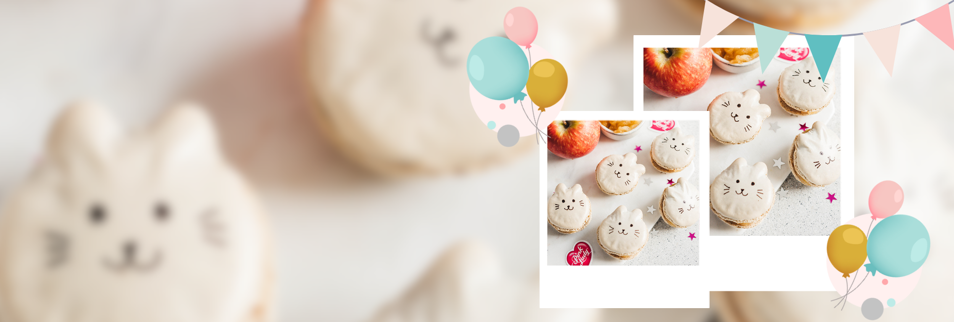 Estos macarons de manzanacon forma de gatito son tan originales como deliciosos. Se preparan con azúcar, almendra molida, claras de huevo y compota de manzanas PinKids®, por lo que es una fantástica opción de merienda sin gluten para los más pequeños.