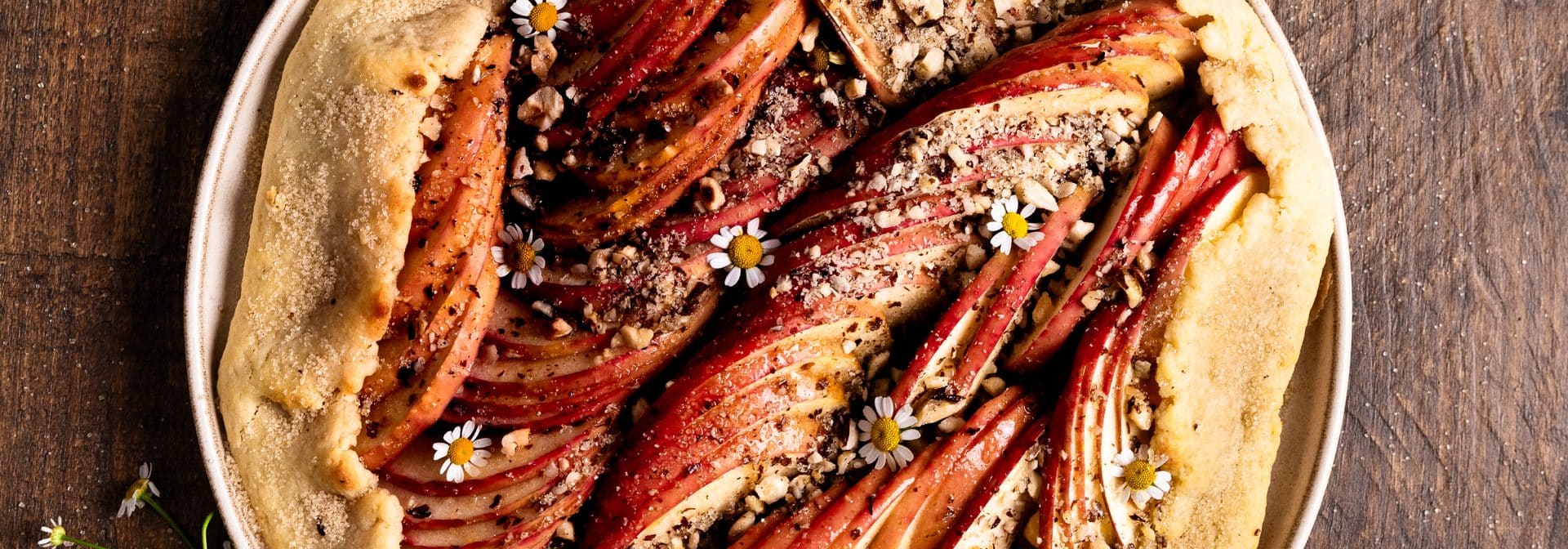 La tarta rústica de miel y manzanas Pink Lady® de @quandjuliepatisse es una auténtica delicia. Julie, repostera titulada, emprendedora dinámica, columnista y joven madre, guarda más de un as en la manga. Y quiere celebrar la dulzura del otoño con esta rica tarta de manzanas Pink Lady® y miel.
